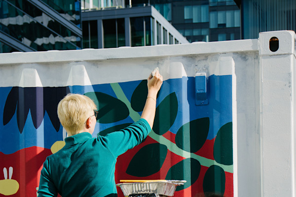 Nine murals, a reflective light installation, and a participatory wall with 2,000 paper clips making shipping containers in the Boston Seaport feel like home.